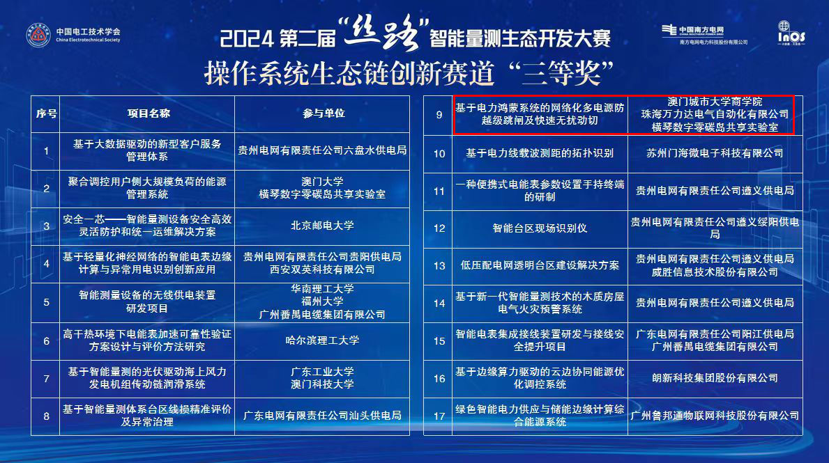 20241123日,珠海萬(wàn)力達電氣技術(shù)股份有限公司與澳門(mén)城市大學(xué)商學(xué)院、橫琴數字零碳島共享實(shí)驗室聯(lián)手參賽,以基于電力鴻蒙系統的網(wǎng)絡(luò )化多電源防越級跳閘及快速無(wú)擾動(dòng)切換為主題的創(chuàng )新作品,在中國電工技術(shù)學(xué)會(huì )主辦的2024第二屆中國電氣工程大會(huì )暨展覽會(huì )及絲路智能量測生態(tài)開(kāi)發(fā)大賽中,憑借卓越的創(chuàng )新實(shí)力和技術(shù)優(yōu)勢,從眾多參賽隊伍中脫穎而出,榮獲操作系統生態(tài)鏈創(chuàng )新賽道三等獎。這是公司在國家級科技賽事中的重大突破,也是對公司長(cháng)期堅持技術(shù)創(chuàng )新與產(chǎn)學(xué)研深度合作的高度肯定。