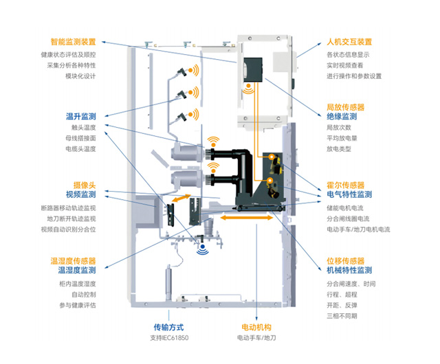 智能開(kāi)關(guān)柜可根據用戶(hù)需求,在普通柜上進(jìn)行相應傳感器及電動(dòng)機構的改造加裝,配置各智能功能。通過(guò)各種傳感器分別測量分、合閘線(xiàn)圈及電機電流、關(guān)鍵點(diǎn)溫度、柜內溫濕度、開(kāi)關(guān)動(dòng)作行程等信息,結合開(kāi)關(guān)狀態(tài),經(jīng)過(guò)復雜的邊緣計算和內置標準診斷模型,能夠精準預判設備運行中的各種隱患,給出開(kāi)關(guān)柜的健康指標,實(shí)現監測預警。